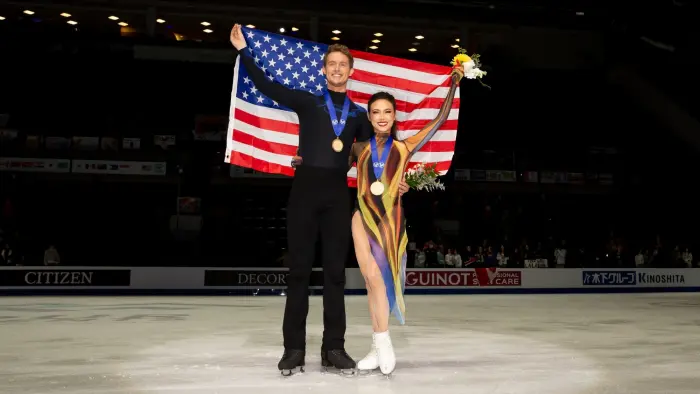 Американская танцорша Мэдисон Чок — сама себе дизайнер. Она рисует эскизы своих костюмов, превращая лед в арт-инсталляцию. Ее платье для произвольного танца сезона 2022/2023 выглядело как поток расплавленного золота и воды. Слои ткани, невероятное количество страз, сложная конструкция спины.