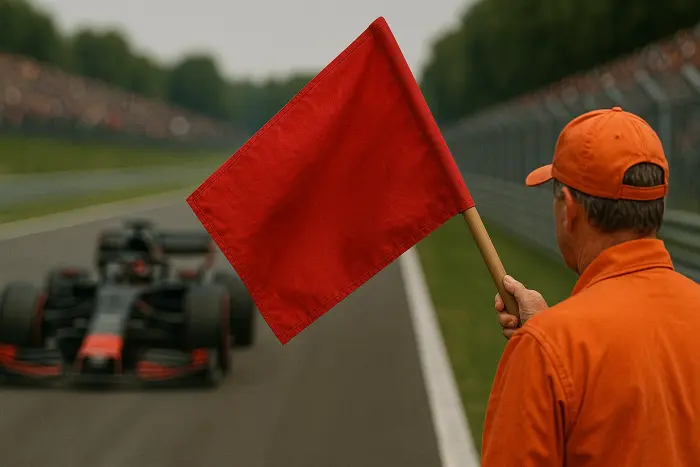 Красный флаг — самый радикальный сигнал в гонке. Он означает немедленную остановку сессии. Все пилоты обязаны замедлиться, прекратить борьбу и медленно вернуться на пит-лейн или к специальной линии на стартовой прямой, в зависимости от инструкций дирекции гонки. Красный флаг появляется только в самых экстренных ситуациях, когда продолжать заезд небезопасно для участников или зрителей.
