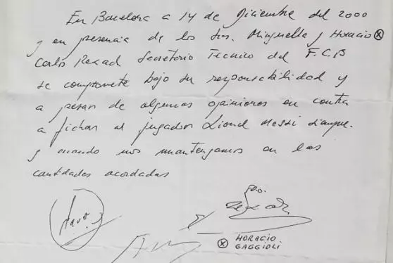 "В Барселоне 14 декабря 2000 года в присутствии (Хосепа Марии) Мингеллы и Орасио (Гаджиоли) Карлес Решак , спортивный директор ФК "Барселона", настоящим соглашается, под свою ответственность и независимо от любых несогласных мнений, обязуется подписать игрока Лионеля Месси при условии соблюдения согласованных сумм."