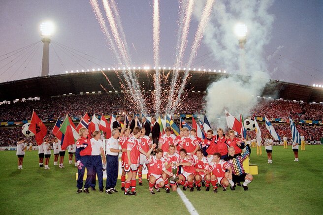 Здесь тоже прошёл интересный турнир. Нам смешно и немного забавно будет понимать как можно собраться на турнир за несколько дней. Но именно за несколько дней до начала турнира сборная Дании была оповещена о нём. И произошло это в 1992 году. В связи с распадом Югославии сборная от этой страны была снята с турнира. А сборная Дании просто-напросто не прошла отбор. Но в связи с тем, что команда Югославии не смогла присутствовать на турнире, то сборной Дании пришлось оторваться от пляжа. Да, да их привезли оторвав от пляжного отдыха. И понимая сложившуюся ситуацию ничего не ждали, но она смогла одержать победу. Даже учитывая тот факт, что от сборной Дании на матч не явился Микаэль Лаудруп, поругавшийся с тренером.