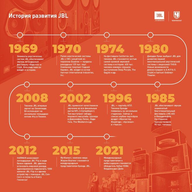 По мере развития футбола развивался и бренд JBL. И вместе они шагают не разрывно уже не первый год. Бренд умудрился продать 100 млн портативных акустических систем по всему миру, в этом году бренду исполняется 75 лет. Основатель бренда Джеймс Буллоу Лэнсинг даже и не мечтал о таких успехах. Кстати название состоит из первых трёх букв его имени. Бренд начал свою работу в 1946 году.
