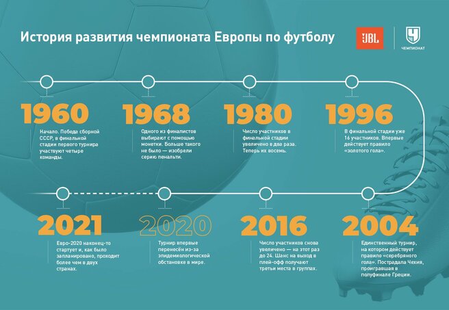 ЧЕ – это не только игры и турниры, это история громких побед и поражений, череда событий и эмоций. Кстати в этом году есть ещё один юбилей у бренда — JBL, который очень тесно связан с ЧЕ. Потому что матч без звука это уже не матч. Не говоря уже о объявлениях команд и гимна. В общем стадион без мощной аудиосистемы уже не стадион. В этом году юбилей и у того и у другого, поэтому предлагаем окунуться в историю звука и футбола.